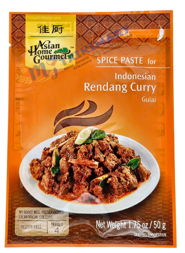 Pasta de especias gourmet Asian Home para curry rendang indonesio (Gulai) 50 g. El curry rendang es un curry picante y seco, muy apreciado en Indonesia, que presenta carne cocinada a fuego lento hasta alcanzar una ternura excepcional, combinada con un rico sabor a coco y especias intensas y ácidas.